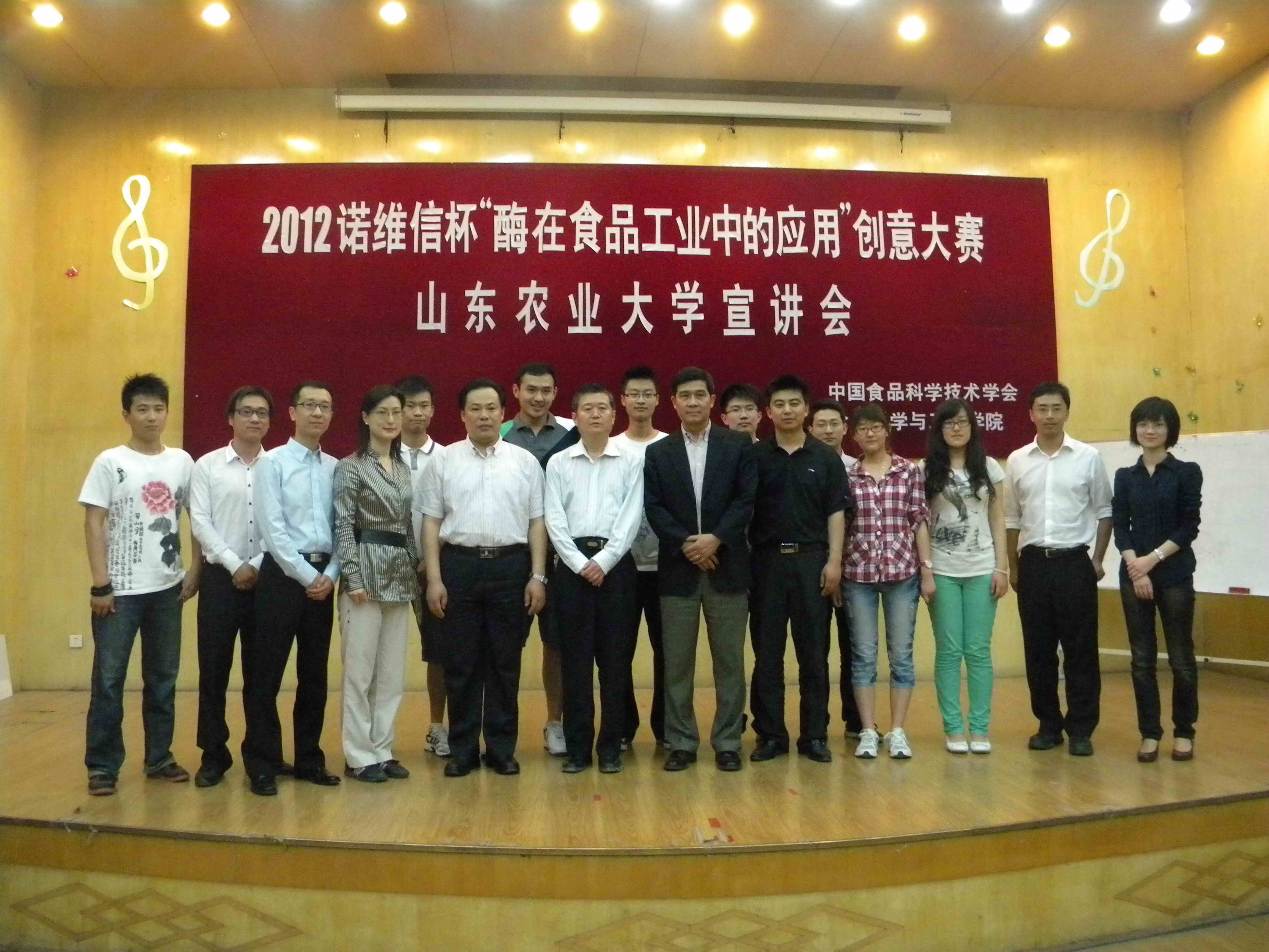 5月5日,由中国食品科学技术学会和诺维信(中国)投资有限公司主办的2012诺维信杯“酶在食品工业中的应用”创意大赛山东农业大学宣讲会,在北校区5N学术与报告厅顺利举办。中国食品科学技术学会专员黄磊,诺维信(中国)投资有限公司大中华区高级总监李力,诺维信(中国)投资有限公司应用开发部经理韩望博士,诺维信(中国)投资有限公司人员及组织发展部经理胡晓勇,诺维信(中国)投资有限公司可持续发展专员江涛一行5人;食科学院党委书记于林,副院长乔旭光,院党委副书记田保状,院团委全体成员,近300名来自食科、生科学院的本科生、研究生参加本次宣讲活动。