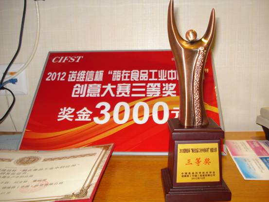 会上,国内外优秀科学家、企业家就学术热点和行业发展作主题发言。本次会议期间,还就今年开展的杜邦TM丹尼斯克○R学生创新竞赛、盼盼食品杯烘焙食品创意大赛、李锦记杯学生创新大赛、康师傅杯大学生创新性研究竞赛、娃哈哈恒枫杯“中国味,为中国 ”大学生创意大赛、诺维信杯“酶在食品工业中的应用”创意大赛、美国大杏仁学生创新大赛等7项赛事,举行颁奖仪式。这些学生创新竞赛活动在全国100多所食品专业院校中得到了良好的发展,近万名学生参与到竞赛的活动中,来自我校食科学院的李睿、曹婉莹、刘文哲、于跃、卢鑫等同学组成的团队和张琳琳、栾兆为等同学组成的团队进入2012诺维信杯“酶在食品工业中的应用”创意大赛全国“前八强”,并荣获三等奖。中国食品科学技术学会常务理事、浙江省食品科学技术学会理事长、渤海大学副校长励建荣和诺维信投资(中国)有限公司可持续发展部门总监邓�h女士为获奖的同学颁发了奖杯及证书。