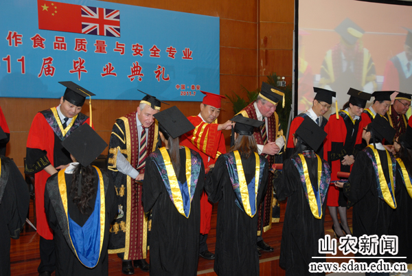7月2日,山东农业大学首届中英合作食品质量与安全专业毕业典礼在文理大楼学术报告厅隆重举行。英国皇室查尔斯王子代表、皇家农学院理事长西蒙•波特、农学院校长克里斯•加思卡和山东农业大学校长温孚江、副校长张宪省、车先礼等共同为108名学生颁发山东农业大学和英国皇家农学院毕业证书。