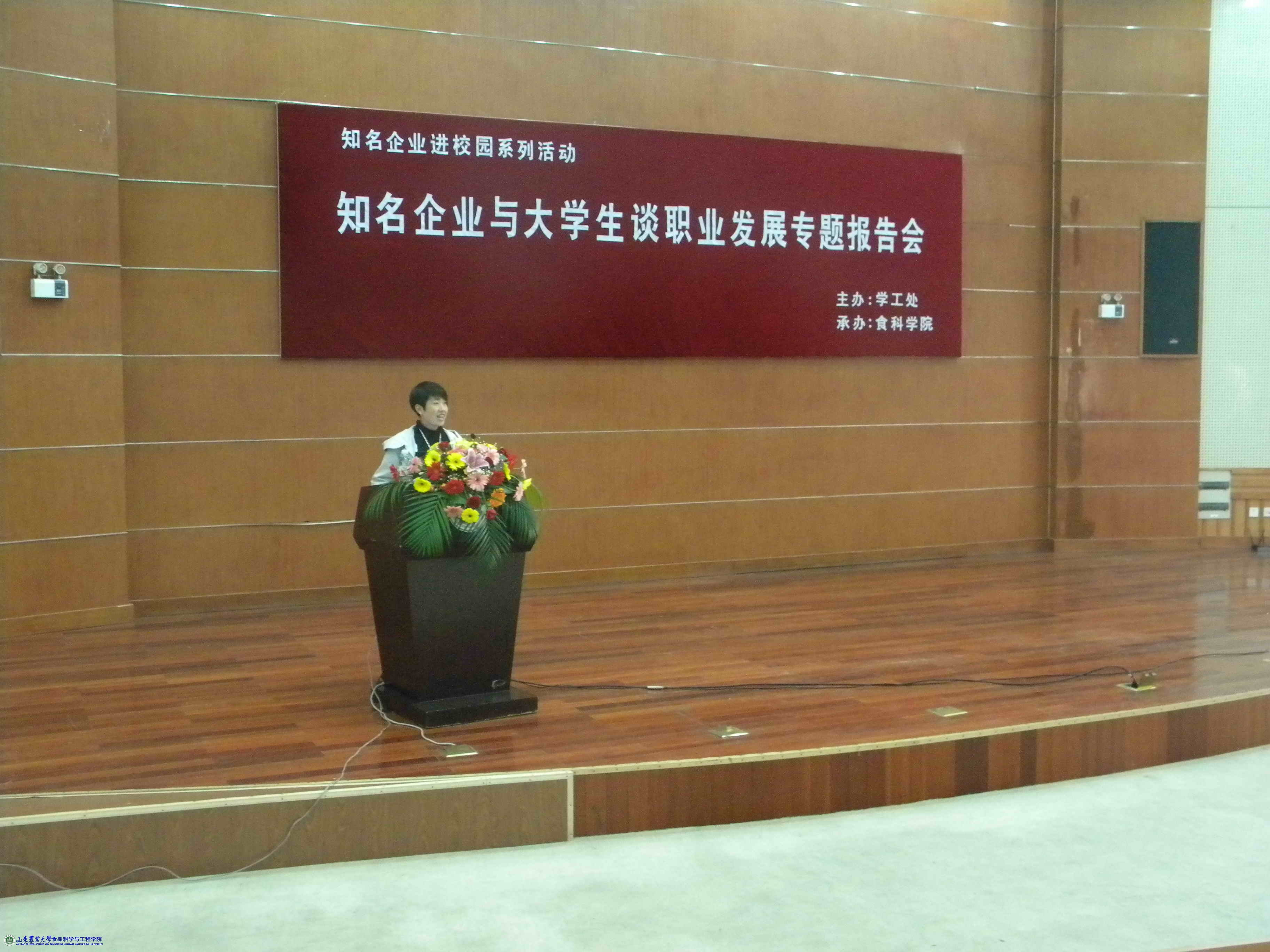 ![]() 10月27日下午,食科学院在校本部文理大楼学术报告厅举办“知名企业农大行”系列活动之“知名企业与大学生谈职业发展”专题报告会。专题报告会由食科学院邀请山东六合集团有限公司肉食事业部人力资源总监于露霞女士,为食科学院高年级同学做了“与大学生谈职业发展”为主题的专题报告会。 山东六合集团有限公司肉食事业部副总经理谢荣山先生,山东六合集团有限公司肉食事业部人力资源总监助理张玉女士;食科学院副院长罗欣教授,学院学生工作负责人、学院团委负责人,500多名食科学院高年级同学和部分兄弟学院的同学一起参加本次专题报告会。 于露霞总监以一个生动有趣,老者教授少年在沙中拾珠之智慧的故事,拉开了报告会的序幕,睿智机敏的风采即刻捉住了全场观众的注意力,报告一开始即拉近了与同学们的距离。于露霞在报告中全面分析了当代大学生所处的时代特点,指出职业生涯是一个人终生的工作经历,职业化的过程,是不断挑战自我,和不良习惯做斗争的过程。她联系自身学习、工作和发展实际,以自己一个“70后”的视角,对现场的“80后”“90后”们进行了成长、成才,做人、做事的启发教育;她旁征博引,广开言路,教育大家要做真诚、善良、阳光、正向的人。于露霞结合自己十余载职场打拼的经历,诚恳的告诫大家做事先做人,多替别人着想是一种好品格、好智慧;职场新人要懂得对人宽容、宽厚的道理。要善于接受变化,学会适应和服从,做好角色转化,学会放下身段特别是放下大学生的优越感和架子,用善于沟通的办法学会与人相处。于露霞对成功有着独到而智慧的见解,她认为成功没有一定的模式,只要将自己把握好,再加上有远大理想,有坚定有决心,有执著追求,有一丝不苟、精益求精的韧劲,就是成功的人。她强调大学生在校期间要做好自己的职业规划,始终将学习作为上大学的第一要务,让学校成为自己职业生涯的坚强后盾,给自己踏入社会时制造一个较高的起点。 报告会现场气氛热烈,高潮迭起,于露霞总监用大学生喜闻乐见的语言,以通俗易懂的方式将大学生专业、学业、职业的相关理论创新和实践创新说到了同学们的心坎里。她用事实说话、用数字说话,不说大话空话,不摆企业家架子,让同学们感到耳目一新、心悦诚服;让同学们感到听得明白、记得清楚、用得方便,确实解渴又解惑。 报告会现场的同学们一次次向于女士幽默风趣、精彩实用的演讲报以雷鸣般的掌声。于露霞总监与同学们进行了互动交流,就同学们关心的求职资本的重要性排序,用人单位与大学生的供需关系,大学生自主创业等话题进行了热烈的探讨并为同学们深入浅出的讲解阐释。 报告会结束后,食科学院有关负责人还与山东六合集团有限公司肉食事业部的领导一起,就如何进一步加强沟通了解、深化互利合作、促进事业繁荣、推动共同发展进行了交流和研讨,在丰富和拓展院企联合方面形成了一致的新思路、新共识、新意向。 ![]() |