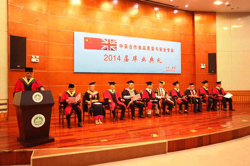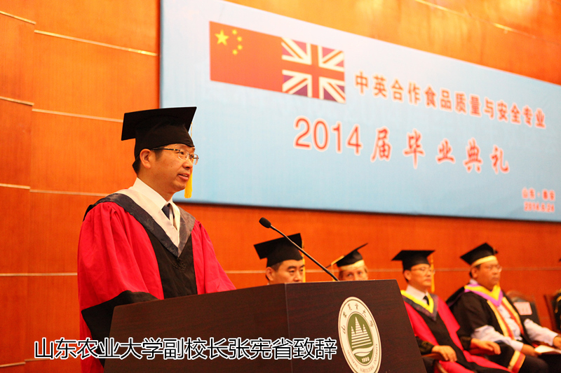 6月24日上午,学校隆重举行中英合作食品质量与安全专业2014届学生毕业典礼。山东农业大学副校长张宪省,英国皇家农业大学中国区主管王啸宇,英国皇家农业大学国际学院院长Jonathan Turner,学术英语负责人Michelle Tutty教授,教师代表Howard James(Ted Carter)教授、Elizabeth Carter教授,以及我校有关部门和食品学院的负责同志出席毕业典礼。