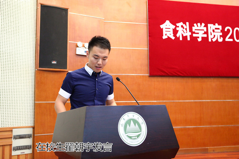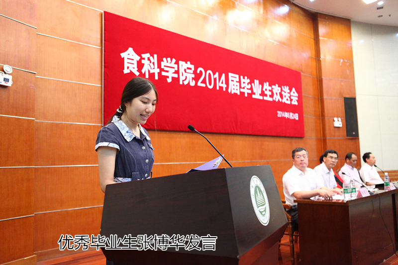 毕业生欢送会在庄严的国歌声中拉开帷幕。首先,优秀毕业生代表张博华发表了毕业感言,总结了大学四年的所思、所学、所获、所悟,饱含深情地表达了对母校的深深眷恋以及对老师,师长的感恩。随后,在校生代表翟朝宇表达了对师哥师姐三年帮助的感谢,并祝福他们前程似锦,事业有成。紧接着,食科学院院长董海洲为毕业生颁发毕业证书和学位证书,与学生代表合影。欢送会上,学院对省级、校级优秀毕业生,对帮扶就业贡献突出的学生党员,对班级签约就业率达100%班级的班长团支书进行了专门表彰和奖励。食科学院党委书记于林发表了热情洋溢的讲话,鼓励同学们树立正确的人生理想观念,有信心,有决心,培养强烈的事业心和社会责任心,不断提高自身创新能力,为实现中国梦,做出食品人应有贡献,并祝福2014届毕业生一生幸福平安,事业有成。
