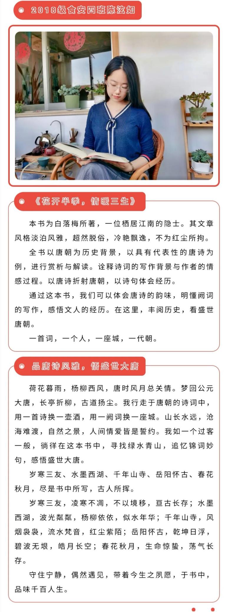 “书中自有颜如玉,书中自有黄金屋”习近平总书记曾在演讲中多次提到,他最大的爱好就是读书。书籍滋养人文情怀,书籍呈现世间百态。疫情期间,食科学院举办好书推荐评选活动,旨在让大学生们尽少沉迷电子产品,而是利用宝贵时间多阅读好的书籍,并将自己的阅读经历分享给大家,传播阅读文化。经过前期筛选和后期投票结果综合评定,最终,共有8位同学荣获“最佳推荐者”荣誉称号,他们分别是: