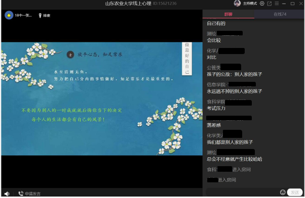 值此“5.25”心理月之际,由学工处 ,大学生心理教育中心主办,食品科学与工程学院承办了山东农业大学“疫路同行”线上心理沙龙活动,更好地促进同学们感恩生活,抗逆成长。