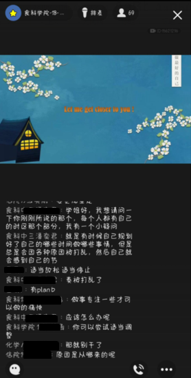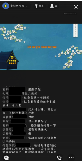 第一期活动中带领人食科学院张瀛方说道:“生活不止于此,也不至于此!”,鼓励同学们做自己,不要羡慕别人,活出自己的精彩,引发多位同学共鸣,大家纷纷发表文字评论和感悟,及时抒发自己的小感触。