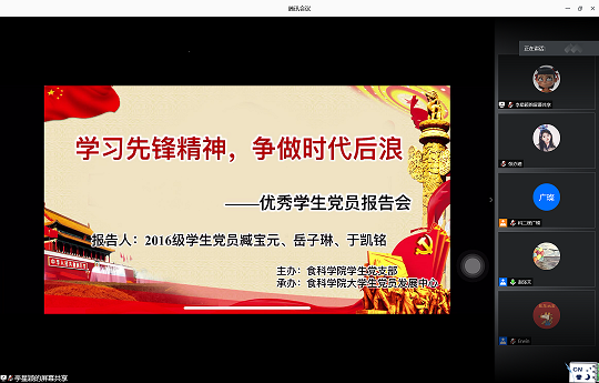 为迎接中国共产党99周岁生日,坚定学生党员理想信念, 6月30日下午,食科学院学院举办2020年大学生党员发展中心换届仪式暨优秀学生党员报告会,活动采用云直播方式进行,学院党委副书记王利同志、学生党支部全体成员、全体入党积极分子参会,会议由支部书记于小艳同志主持。