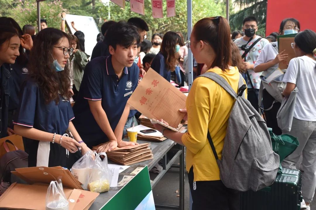 新生报到处,院领导、专业老师带领食科学院迎新师生开展迎新工作,各班主任老师、班助及学督同学在各班报道处为新生发放物资,详细告知报到事项,做好报到登记,并相互留下联系方式。