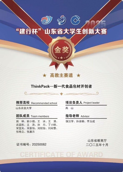 在大众创业、万众创新的时代浪潮下,我院始终秉持“以赛促学、以赛促创”的育人理念,鼓励学子将专业知识转化为创新实践成果。以高山为负责人的创业团队,凭借《ThinkPack-新一代食品包材开创者》项目在建行杯山东省大学生创新大赛中斩获金奖,用实干与钻研书写了一段属于食品专业学子的科创佳话,为全院同学树立了创新创业的优秀榜样。