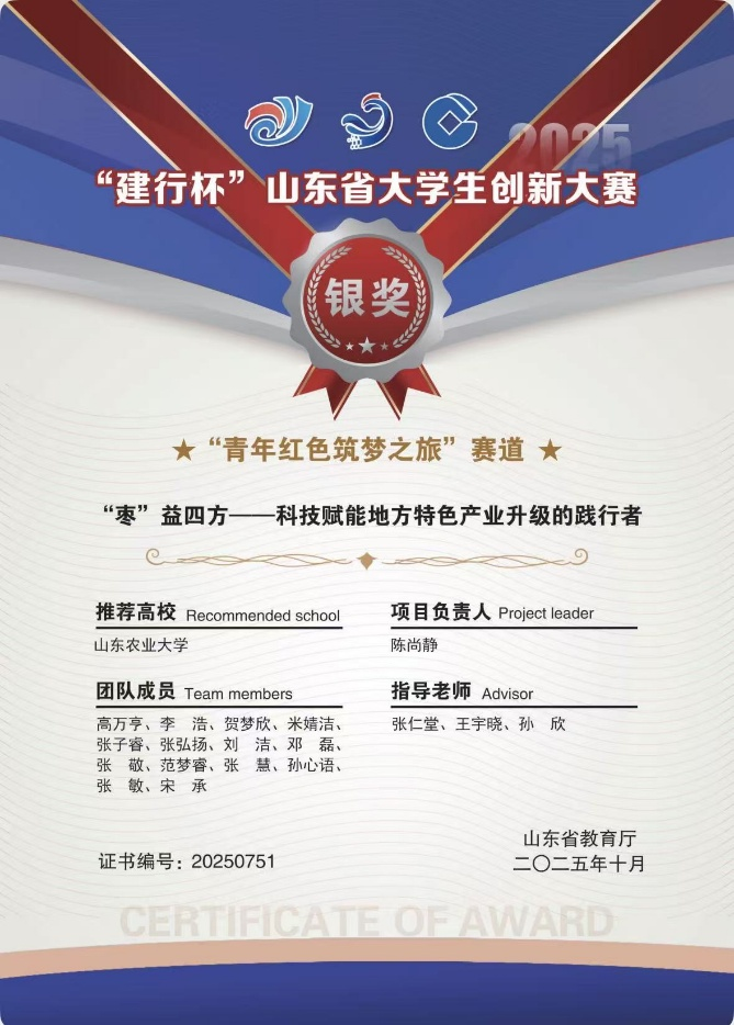 近日,在备受关注的建行杯山东省大学生创新大赛中,我校以陈尚静为负责人的创业团队凭借《“枣”益四方-科技赋能地方特色产业升级的践行者》项目,从全省众多参赛作品中脱颖而出,成功斩获省级银奖。这一成绩的取得,不仅是团队成员不懈努力的丰硕成果,更彰显了我校学子扎根地方、勇于创新、服务基层的创业精神,为全校青年学子树立了创新创业的优秀典范。