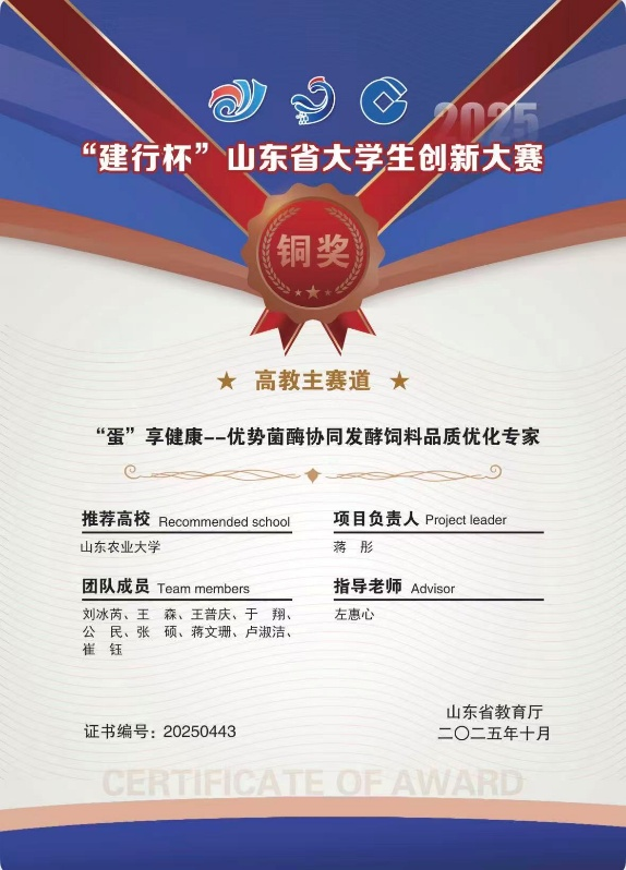在建行杯大学生创新大赛中,我校蒋彤带领的创业团队凭借《“蛋”享健康——优势菌酶协同发酵饲料品质优化专家》项目,从全省百余支参赛队伍中脱颖而出,斩获省级铜奖。这一荣誉的背后,是团队成员数月如一日的坚守与付出,更彰显出当代大学生扎根实践、敢闯敢试、协同奋进的创业精神,为学院创新创业教育写下生动注脚。