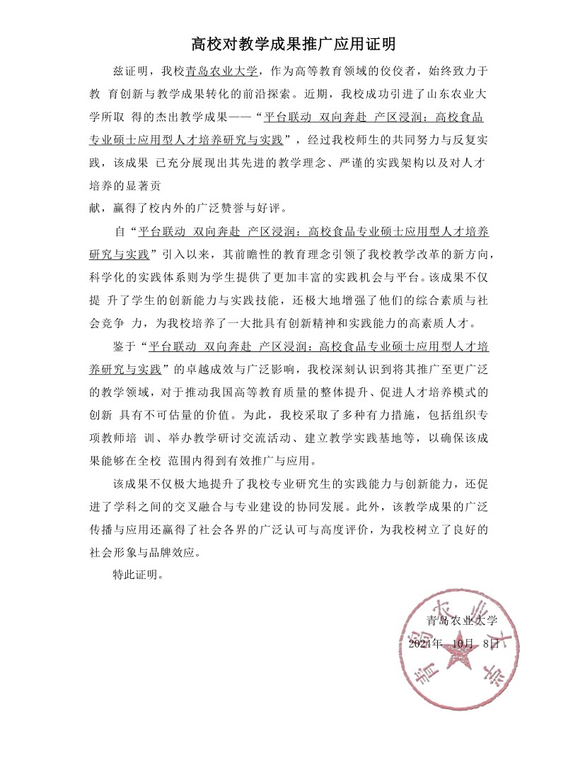 【应用证明】青岛农业大学对教学成果推广应用证明