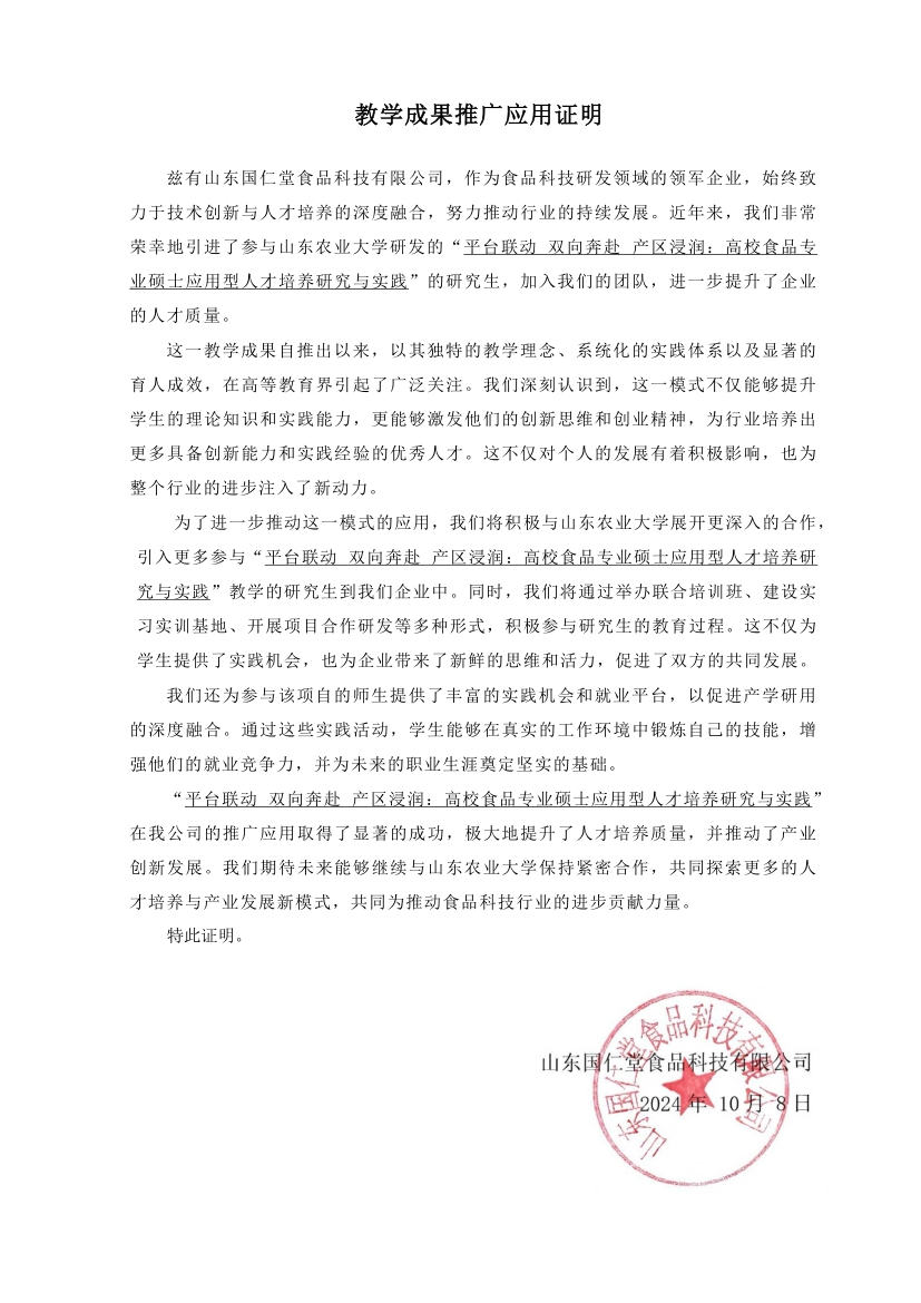 【应用证明】山东国仁堂食品科技有限公司推广应用证明