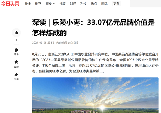 【今日头条】今日头条报道《乐陵小枣荣登“2023 中国果品区域公用品牌价值榜”,位列全国红枣品类品牌第三——33.07 亿元品牌价值是怎样炼成的》