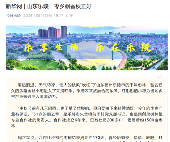 【新华网】今日乐陵公众号发布《山东乐陵:枣乡飘香秋正好》