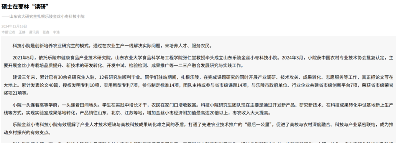【山东农业大学校报报道】山东农业大学校报报道《硕士在枣林“读研”》