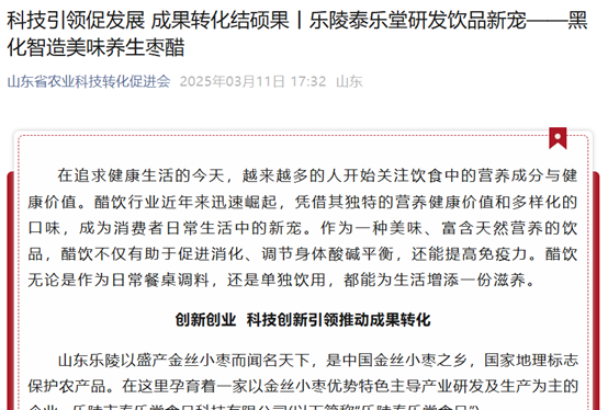 【山东省农业科技转化促进会】山东省农业科技转化促进会公众号发布《科技引领促发展 成果转化结硕果|乐陵泰乐堂研发饮品新宠--黑化智造美味养生枣醋》