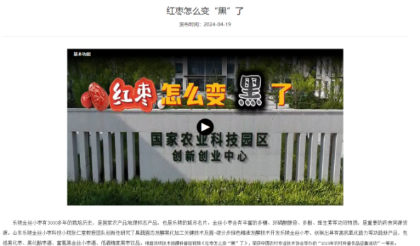 乐陵金丝小枣有3000多年的栽培历史,是国家农产品地理标志产品,也是乐陵的城市名片。金丝小枣含有丰富的多糖、环磷酸腺苷、多酚、维生素等功效物质,是重要的药食同源资源。山东乐陵金丝小枣科技小院张仁堂教授团队创新性研究了果蔬固态发酵黑化加工关键技术及固-液分步绿色精准发酵技术开发乐陵金丝小枣,创制出具有高抗氧化能力等功能新产品,包括黑化枣、黑化酚枣酒、富氢黑金丝小枣酒、低酒精度黑枣饮品。根据该项技术拍摄科普短视频《红枣怎么变“黑”了》,荣获中国农村专业技术协会举办的“2023年农村科普作品征集活动”一等奖。