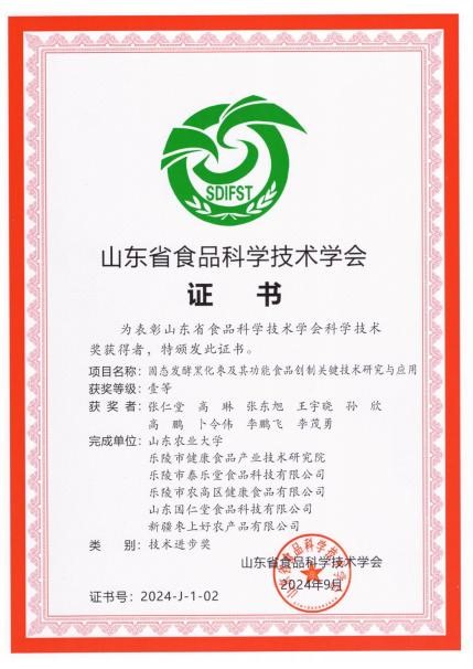 【技术进步一等奖】山东省食品科学技术学会技术进步奖一等奖