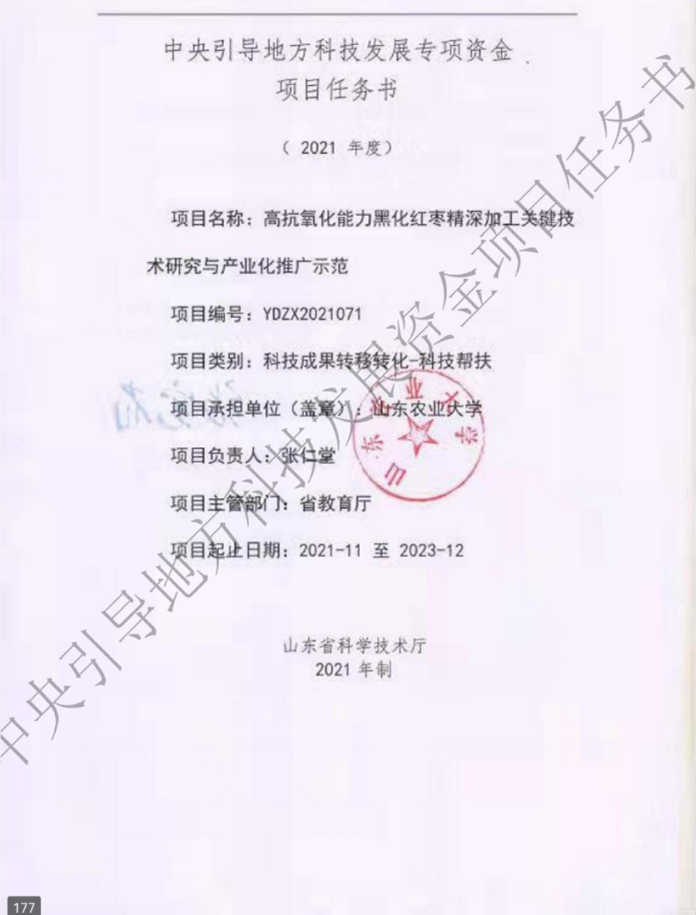 【中央引导地方科技发展专项资金】高抗氧化能力黑化红枣精深加工关键技术研究与产业化推广示范