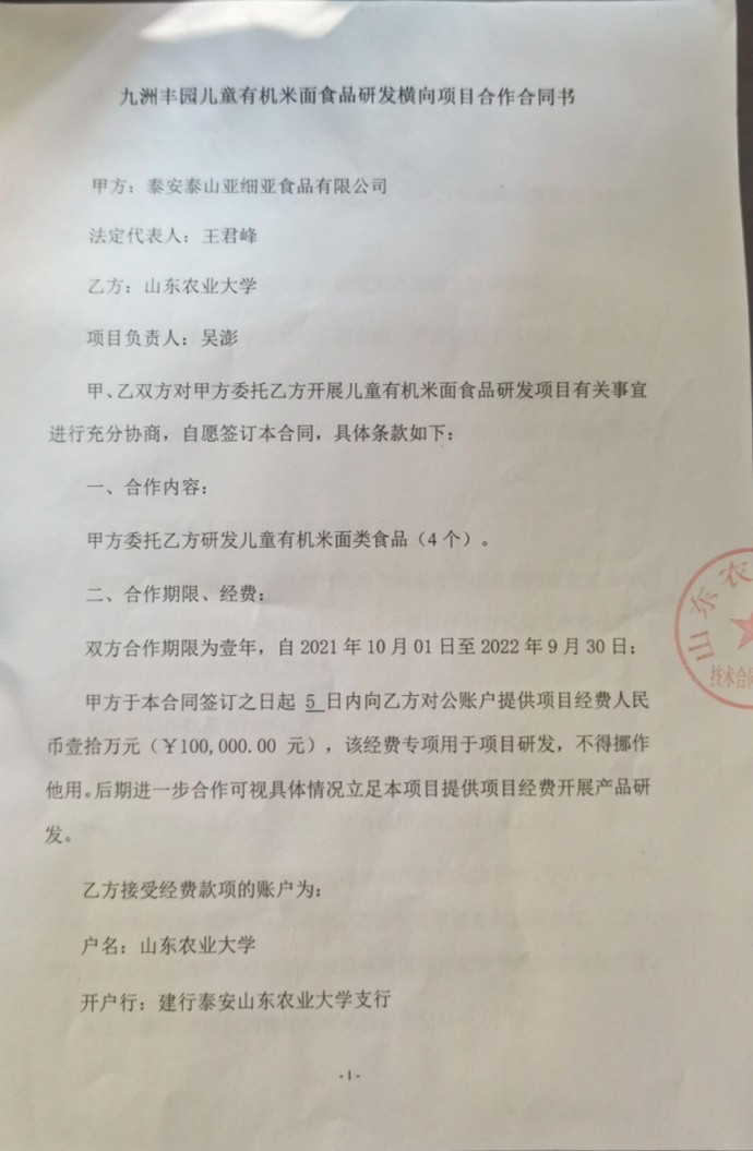 【横向课题】九洲丰园儿童有机米面食品研发横向项目合作合同书