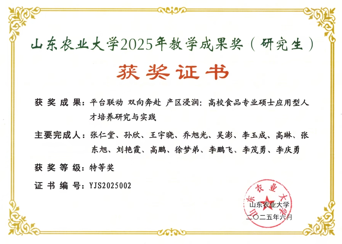 【研究生教学成果特等奖】2025年山东农业大学研究生教学成果特等奖“平台联动 双向奔赴 产区浸润:高校食品专业硕士应用型人才培养研究与实践”
