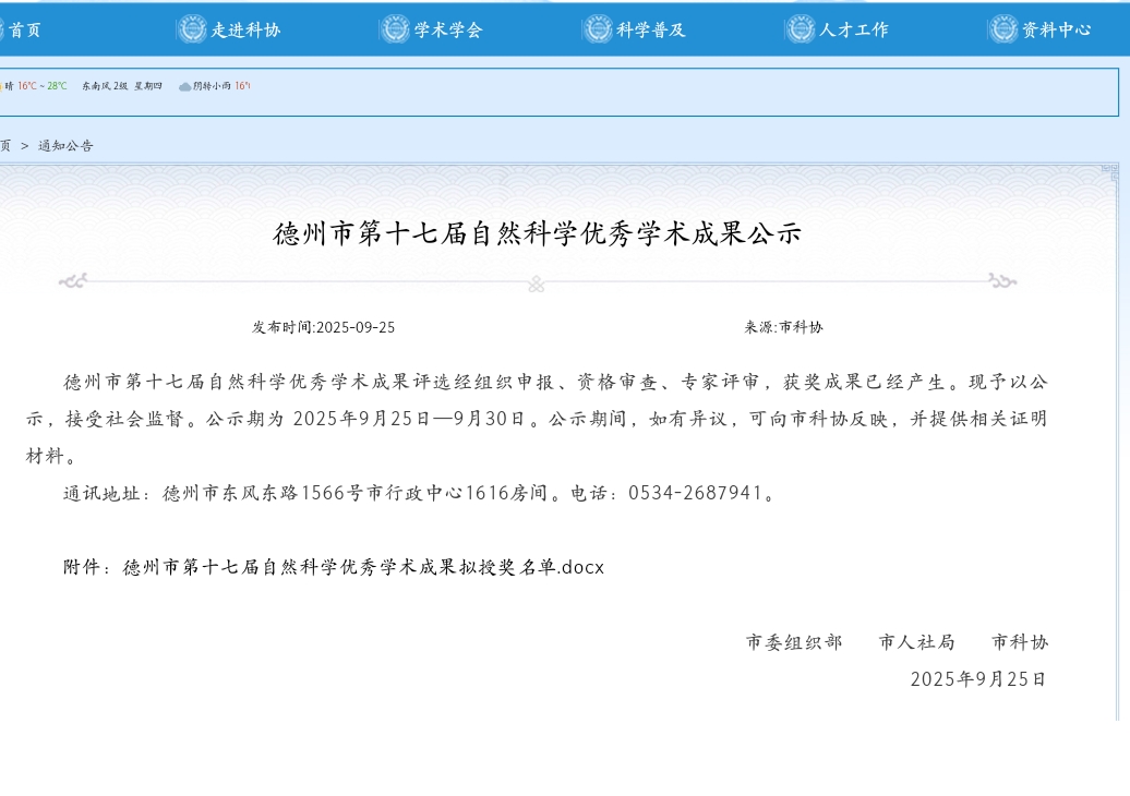 【优秀学术成果奖】德州市第十七届自然科学优秀学术成果三等奖