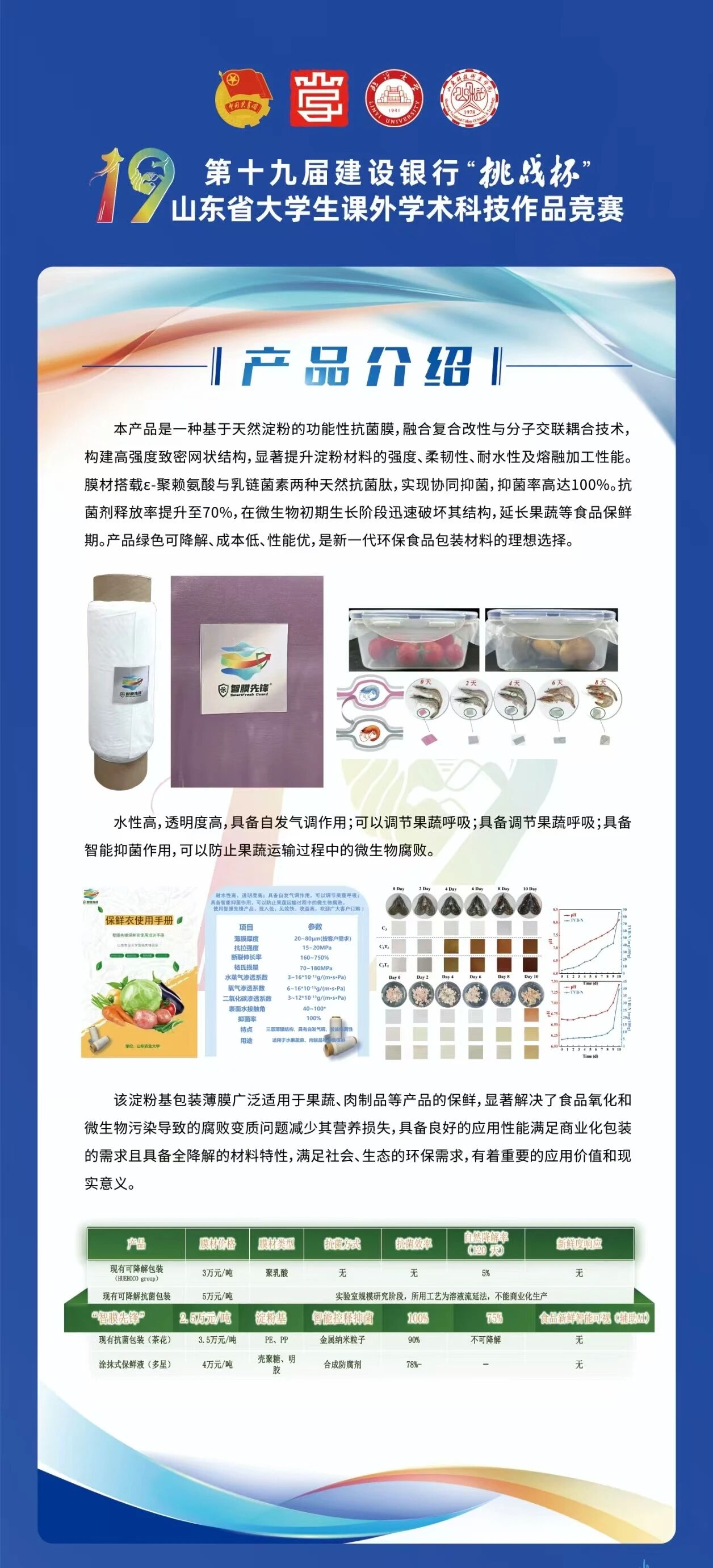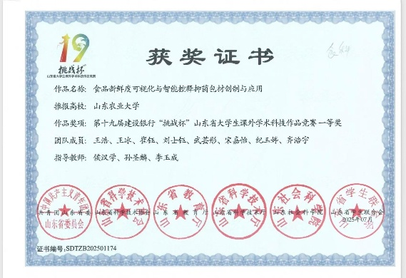 在“双碳”战略与环保新政的时代浪潮下,食品包装行业对绿色、安全、高性能材料的需求日益迫切。正是在这样的背景下,我院以王浩为负责人的“智膜先锋”团队,带着《智膜先锋——食品新鲜度可视化与智能控释抑菌包材创制与应用》项目,在第十九届建设银行“挑战杯”山东省大学生课外学术科技作品竞赛中脱颖而出,一举斩获省级一等奖,刷新了学院近年在该项赛事中的最好成绩。