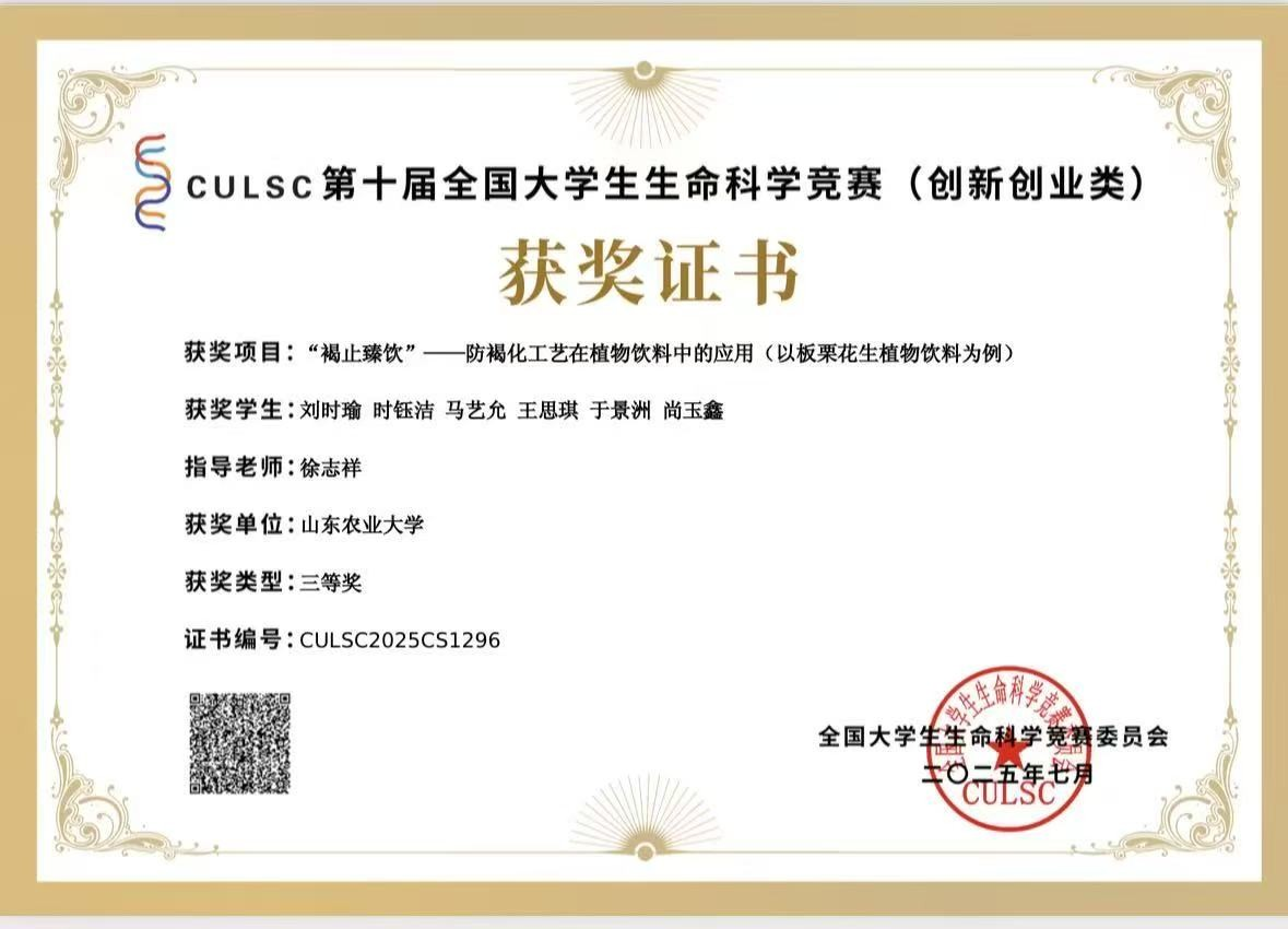 近日,全国大学生生命科学竞赛(2025,创新创业类)国家级评选结果揭晓,我院刘时瑜、时钰洁、马艺允、王思琪、于景洲、尚玉鑫组成的团队凭借《“褐止臻饮”——防褐化工艺在植物饮料中的应用(以板栗花生植物饮料为例)》项目,在历经山东赛区二等奖的淬炼后,再度突破重围斩获国家级三等奖。这份荣誉不仅是团队成员潜心钻研的成果,更彰显了我院在生命科学应用领域的科研实力与创新实践水平,为全院学子的创新创业之路树立了鲜活榜样。